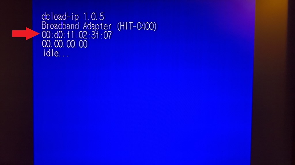 With dcload-ip running on your Dreamcast, you should see a MAC address displayed.