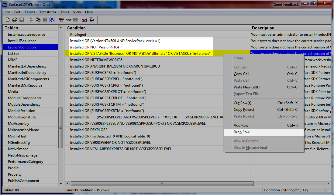 Open the SurfaceSDKWE.msi file in Orca. Select LaunchCondition from the left pane. In the right pane, individually select the rows highlighted in the screenshot below, right-click, and select Drop Row. This will remove the checks for 64-bit, Windows Vista, and Windows Vista SP1. The rows are:
