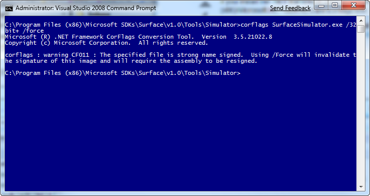Now that the SDK is installed, several executables need to be patched to be forced to run inside the 32-bit CLR instead of the 64-bit CLR. This will be done using the corflags.exe utility. If you have the full Visual Studio installed, simply open an elevated Visual Studio Command Prompt from the Start Menu and the path to corflags.exe will automatically be loaded. Otherwise, you should find this in the C:\Program Files\Microsoft SDKs\Windows\v6.1\Bin directory and you can set your PATH environment variable appropriately.