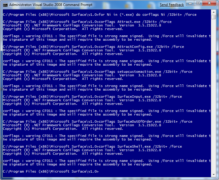 This will enumerate all .exe files and patch them as done above. You will again see the warning, and again, it can be safely ignored.