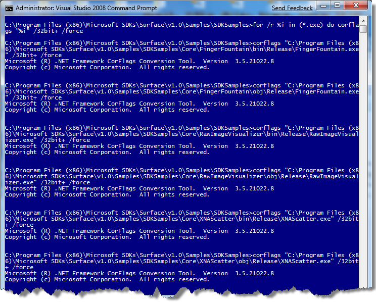 Now we need to patch the built executables. Back in the elevated Visual Studio Command Prompt, change to the directory where you unzipped the sample SDKs. For me, this path is: