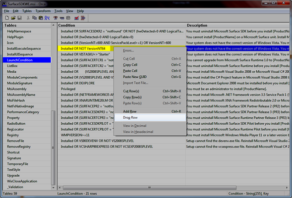 Open the newly extracted SurfaceSDKWE.msi file in Orca. Select LaunchCondition from the left pane. In the right pane, select the row labeled Installed OR NOT VersionNT64, right-click, and select Drop Row. This will remove the check for a 64-bit OS.