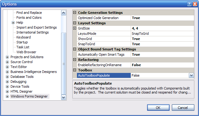 There are over one hundred custom controls contained across these projects. When the application is built and I go to a design surface, VS2005 likes to update the toolbox with every possible drag-and-drop control it can find. As you might imagine, this takes a very long time complete, even on my 3.6GHz dual-core HT processor (Intel 840 EE).