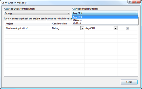 Visual Studio also provides for 3 specific platform targets: x86, x64 and Itanium (IA-64). When building an executable as a specific target, it will be loaded as a process of that type. For example, an x86-targeted executable run on an x64 machine will run as a 32-bit process using the 32-bit CLR and WOW64 layer. When assemblies are loaded at runtime, they can only be loaded by a process if their target matches that of the hosting process, or it is compiled as Any CPU. For example, if x64 were set as the target for an assembly, it can only be loaded by an x64 process.