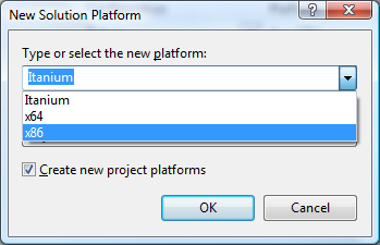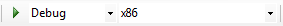 - Click OK to get back to the main Visual Studio window and ensure the x86 configuration is selected in the build bar or in the Platform drop down in the project settings.